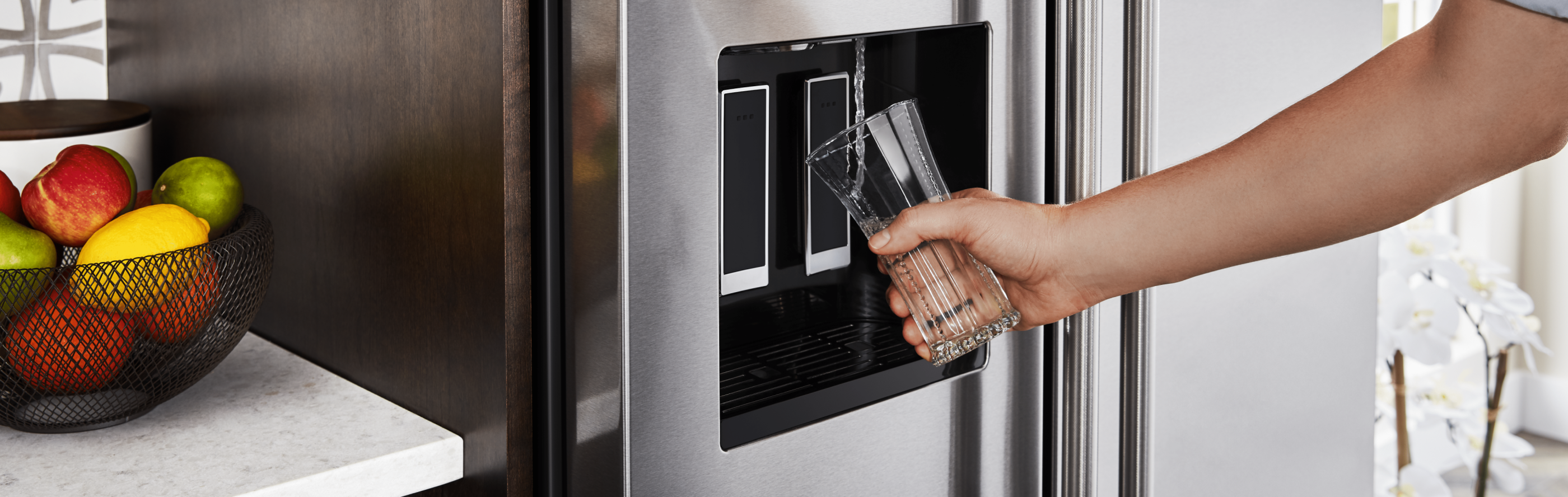 Certain KitchenAid® French Door, Built-in and Side-by-Side Refrigerators feature water dispensers with filters to maintain the crisp taste of water if you perform the necessary maintenance.