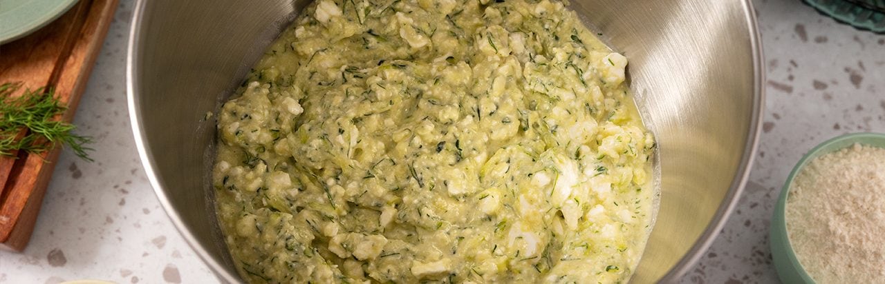 - In the same Stand Mixer bowl (no need to rinse) combine zucchini, flour, feta, remaining ½ cup of the mint, dill, garlic, eggs, and remaining ½ teaspoon salt. Mix on low speed with the Flat Beater Accessory until combined, scraping sides of bowl if needed.