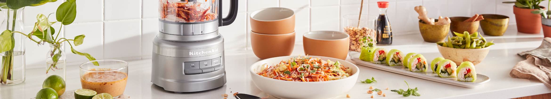 Food processors are the perfect tool to handle larger recipes. Multiple blades offer versatility and the ability to tackle specific food prep tasks (shredding, slicing, julienning, etc.). KitchenAid® Food Processors offer various bowl capacities and feed tube sizes to accommodate bigger batches and larger ingredients like whole potatoes and zucchinis.