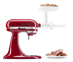 A food grinder attachment can help you make traditional bangers and mash by combining a blend of beef, pork and pork backfat. Easily stuff your sausage by using the Sausage Stuffer Attachment that connects right to your food grinder, or the accessories that are included with the metal food grinder.