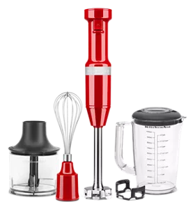 Variable Speed Corded Hand Blender with AccessoriesDesigned for the perfect puree. This KitchenAid® Variable Speed Corded Hand Blender features an 8" removable blending arm with 4-point stainless steel blade to blend everything from smoothies, to milk shakes, soups, sauces and so much more. It is easy to use with the variable speed trigger switch and includes a US patented removal pan guard to help protect your cookware. The 4-Cup BPA-Free Blending Jar with lid is great for individual blending jobs, and can be used to serve direct from or to store your blended creation for a later use. In addition, this model includes a whisk attachment, great for whipping egg whites to fluffy peaks, and also a chopper attachment that quickly and easily chops fresh ingredients. Made in China.