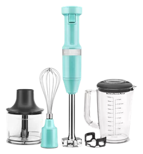 Variable Speed Corded Hand Blender with AccessoriesDesigned for the perfect puree. This KitchenAid® Variable Speed Corded Hand Blender features an 8" removable blending arm with 4-point stainless steel blade to blend everything from smoothies, to milk shakes, soups, sauces and so much more. It is easy to use with the variable speed trigger switch and includes a US patented removal pan guard to help protect your cookware. The 4-Cup BPA-Free Blending Jar with lid is great for individual blending jobs, and can be used to serve direct from or to store your blended creation for a later use. In addition, this model includes a whisk attachment, great for whipping egg whites to fluffy peaks, and also a chopper attachment that quickly and easily chops fresh ingredients. Made in China.