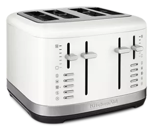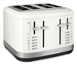4 Slice ToasterMake everyday simply delicious and easily toast your favourite breads, bagels and more with ease. This KitchenAid® 4 Slice Toaster features extra-wide slots to toast a variety of shapes and sizes, including homemade or craft breads. For added convenience the adjustable shade control, from light to dark, ensures you'll have your toast just the way you like it, every time. It's built to last and the durable metal design adds style to your countertop.