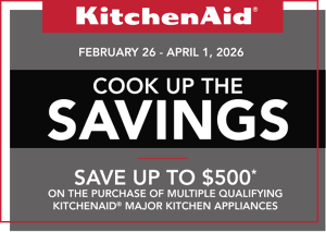 *Ends April 1st, 2026 at 11:59 PM EST. Discount taken off sale price excluding taxes, delivery, install/uninstall, and haul away. Savings of $200 on purchases of 2, $300 on purchases of 3 and Savings of $400 on purchases of 4 and savings of $500 on purchases of 5 or more qualifying KitchenAid® major appliances. Major Appliances limited to qualifying KitchenAid® refrigerators, ranges, cooktops, wall ovens, microwaves, dishwashers, hoods, freezers. Open to Canadian residents only. Delivered to a single Cdn. address. While supplies last.