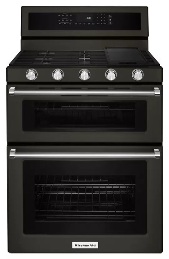 combines a bold blend of professionally-inspired styling with sleek touches for the home. This double oven range features Satin Textured Handles and the KitchenAid® Badge, a symbol of uncompromised quality.