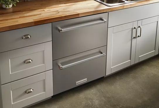 provides a built-in look within a standard 24" base cabinet, so your style stands out, not the appliance. Drawers sit flush with surrounding cabinet fronts when closed.