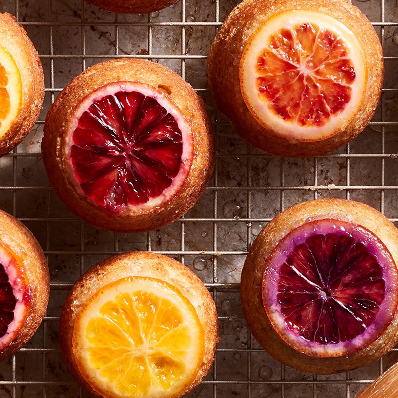 - Assemble the cakes. Use a sharp knife to cut off the ends of four of the citrus fruits. Slice the citrus into very thin rounds, no thicker than 1/8". Remove any seeds from the rounds and place one small citrus round in the bottom of each sugared muffin cavity. (See Chef’s Notes for choosing/placing citrus.)