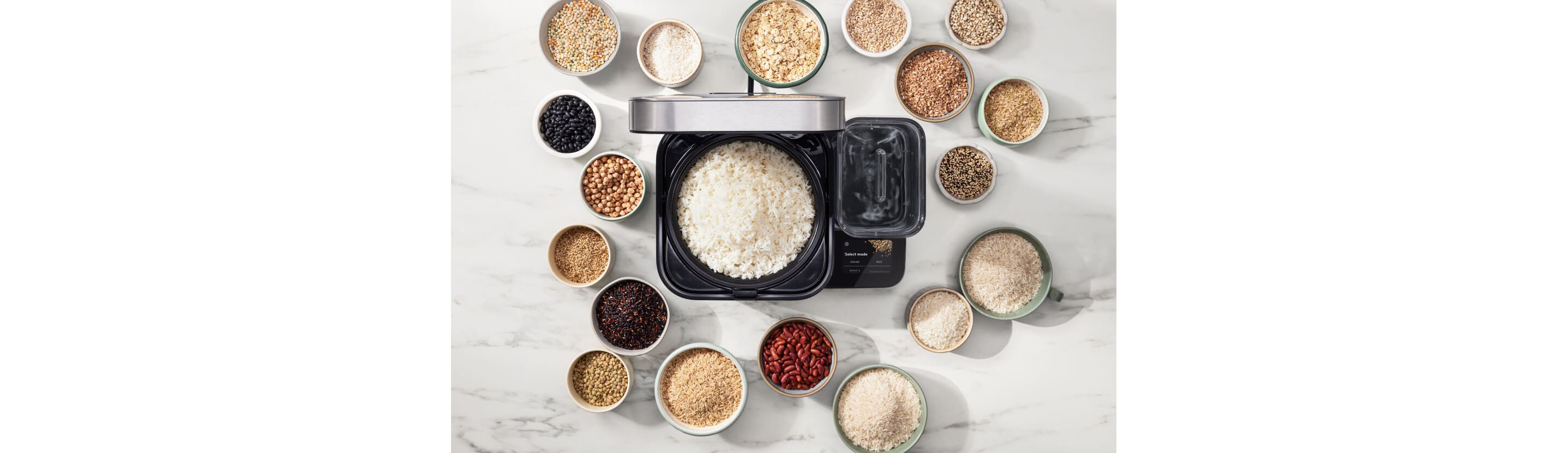 Le cuiseur à grains et à riz s’intègre parfaitement dans votre espace de cuisine avec son allure moderne au fini mat, aux extrémités arrondies et ses commandes tactiles agréables au toucher.