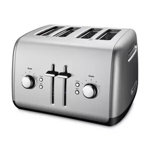Grille-pain à 4 fentes KitchenAid® avec levier de remontée très haute manuelleUn ajout fonctionnel et attrayant à votre comptoir, le grille-pain à 4 fentes KitchenAid® possède toute une gamme de fonctions. Grillage du pain et des bagels au niveau de brunissage désiré, décongélation et rôtissage des produits congelés et réchaud des aliments déjà grillés en moins d'une minute. Avec levier de remontée haute manuelle facilitant le retrait de ce que vous faites griller.