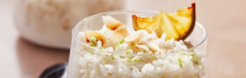 Riz au jasmin au lait et à la noix de coco Essayez cette recette de pouding au riz jasmin et noix de coco végane et sans gluten. Chaque bouchée révèle un équilibre parfait entre le salé et le sucré. -