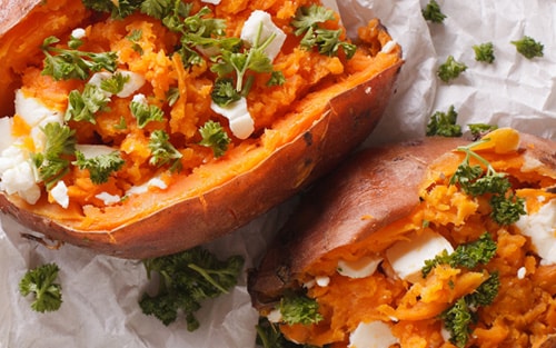 Patates douces cuites à la vapeur et farcies au farro (Végétarien, riche en fibres, bonne source de protéines) Rehaussez vos plats avec cette recette de patates douces farcies au farro. Utilisez votre cuiseur à grains et à riz KitchenAid pour cette recette végétarienne. -
