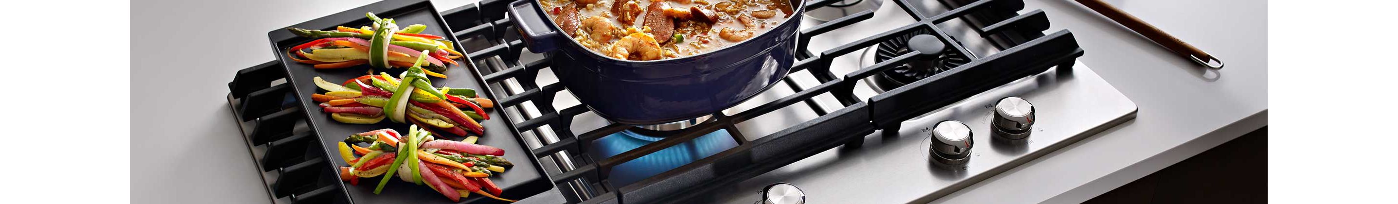 Vous devez tenir compte du nombre, de la taille et du type de brûleurs ou d'éléments chauffants de votre table de cuisson lorsque vous en choisissez une qui conviendra à votre cuisine et à vos besoins. Les tables de cuisson sont généralement dotées de quatre brûleurs de tailles différentes qui peuvent accueillir une grande variété de casseroles et de poêles. Les tables de cuisson à deux brûleurs, peu encombrantes, permettent de placer une petite surface de cuisson à peu près partout. Pour les repas familiaux complets, les tables de cuisson à cinq brûleurs vous permettent de faire mijoter, sauter et bouillir en même temps. KitchenAid offre d'ailleurs une table de cuisson dotée d'une grille amovible qui vous permet de cuire des crêpes, de griller des légumes ou même de saisir des steaks.