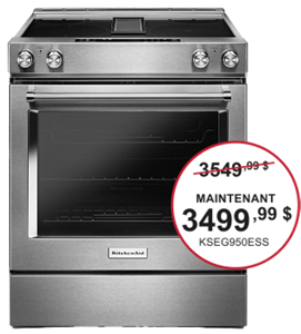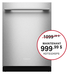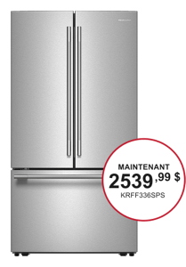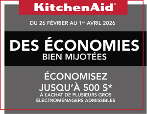 *L’offre se termine le 1er avril 2026 à 23h59 HNE. La remise est appliquée sur le prix de vente, à l'exclusion des taxes, de la livraison, de l'installation/désinstallation et de l'enlèvement. Remise de 200 $ à l'achat de 2 gros électroménagers KitchenAid® admissibles. Remise de 300 $ à l'achat de 3 gros électroménagers KitchenAid® admissibles. Remise de 400 $ à l'achat de 4 gros électroménagers KitchenAid® admissibles. Remise de 500 $ à l'achat de 5 gros électroménagers KitchenAid® admissibles ou plus. Les gros électroménagers sont limités aux réfrigérateurs, cuisinières, tables de cuisson, fours muraux, fours à micro-ondes, lave-vaisselle, hottes et congélateurs KitchenAid® admissibles. Ouvert aux résidents canadiens seulement. Livraison à une seule adresse canadienne. Jusqu'à épuisement des stocks.