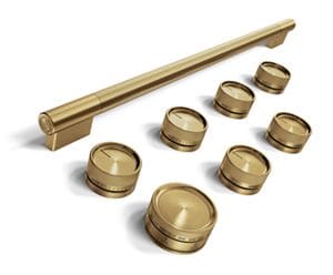 Trousse d'accessoires de personnalisation (poignées et boutons) couleur laiton pour cuisinière au gaz de style commercial de 36 po KitchenAid®Personnalisez votre matériel avec des trousses d'accessoires de poignées et boutons en laiton. Conçue pour s’harmoniser avec les robinets d’évier et les poignées d’armoire, la palette de métaux variés complémente les options de finis extérieurs KitchenAid®, vous pouvez donc assortir les couleurs en toute confiance.