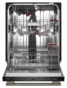 fait de la place pour le troisième panier avec Max Jets™ à 360°, qui peut accueillir 10 verres et tasses supplémentaires*, libérant ainsi de l'espace pour les articles plus volumineux situés en dessous. Les porte-verres à pied dans le panier intermédiaire fixent les verres à vin en place. Les rangées rabattables du panier inférieur permettent d'accueillir des batteries de cuisine de formes et de tailles variées. *Comparativement aux modèles KDFS224S et KDTS224S
